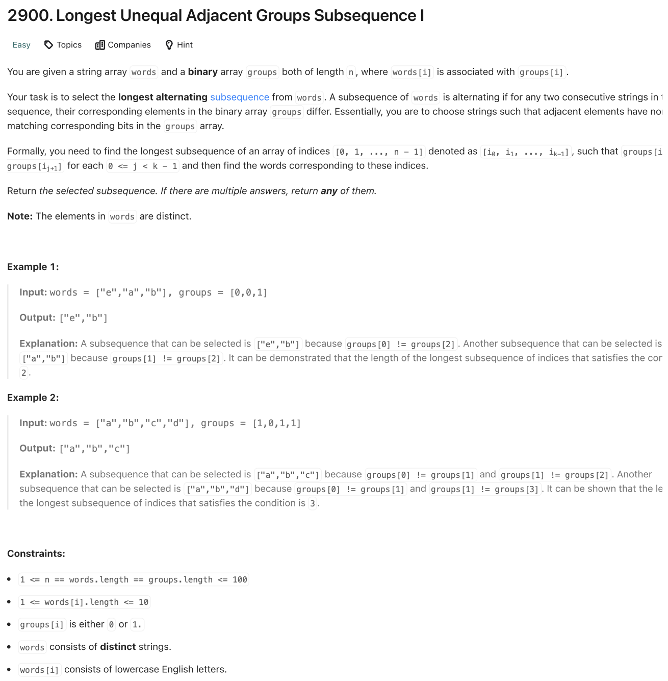 📌 LeetCode [2900]: Longest Unequal Adjacent Groups Subsequence I