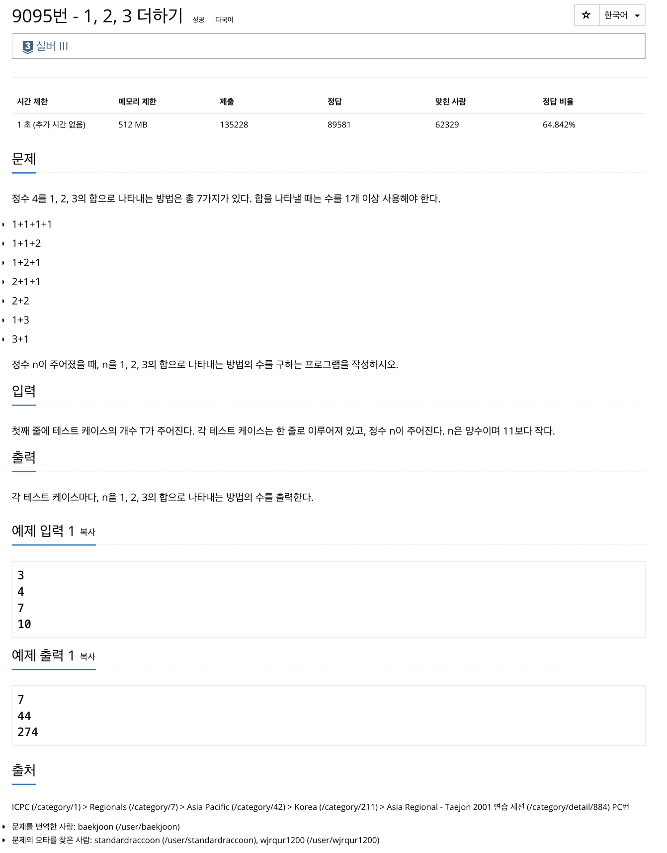 정수 n이 주어졌을 때, 1, 2, 3의 합으로 나타내는 방법의 수를 구하는 프로그램을 작성하시오.