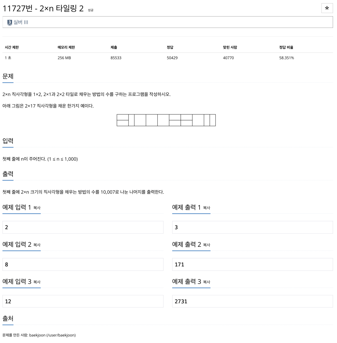 2×n 크기의 직사각형을 1×2, 2×1, 2×2 크기의 타일로 채우는 방법의 수를 구하시오.
