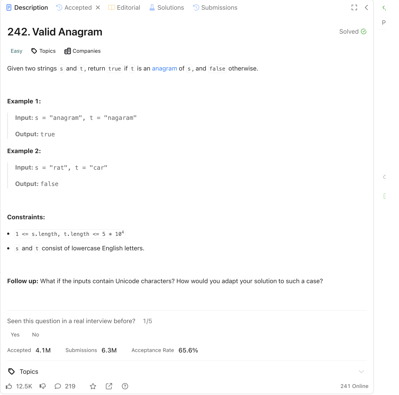 s와t가 주어질 때,t가s의 애너그램(anagram)인지 확인하는 문제입니다.