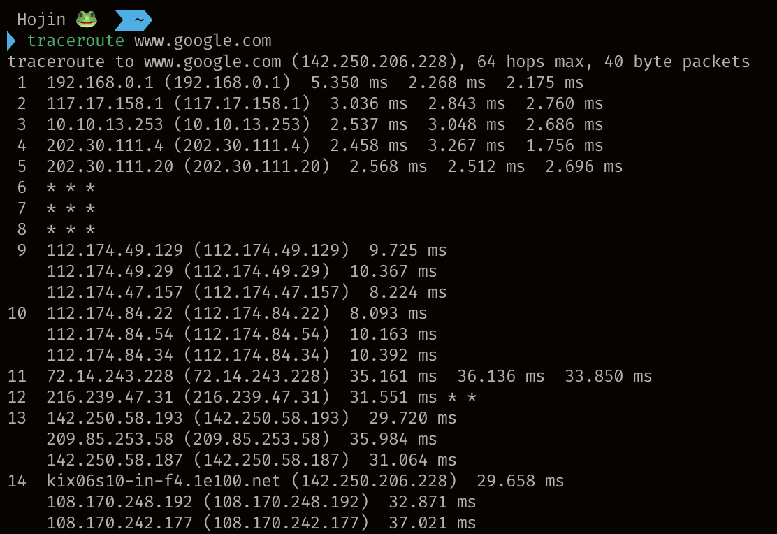 네트워크 지연(time)이나 패킷 손실(packet loss)을 확인할 수 있는데 일관되게 높은 지연 시간이나 패킷 손실이 관찰되면 네트워크 경로상에 문제가 있을 수 있음을 나타낸다.