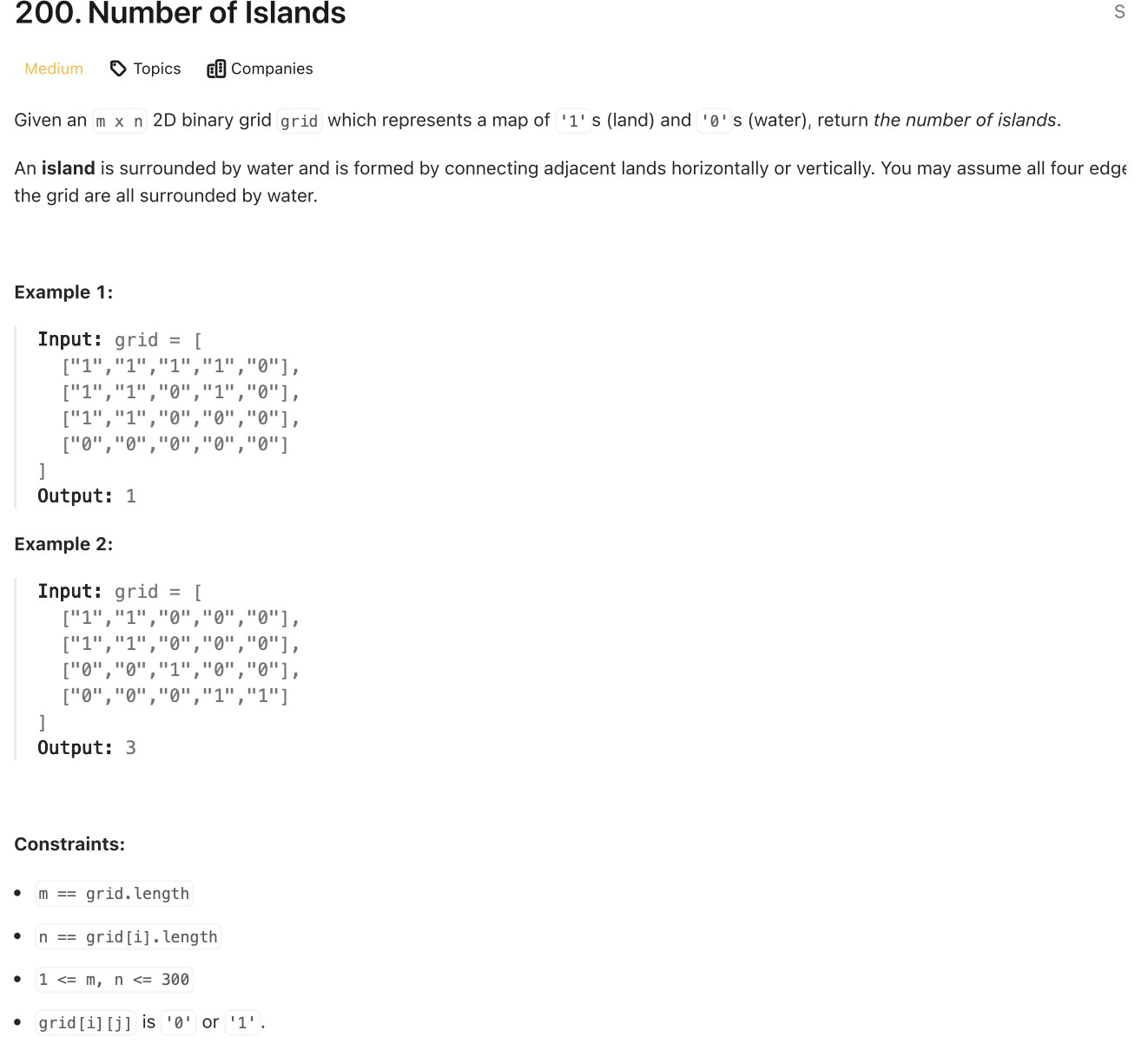 2D 그리드 맵이 주어질 때, '1'(육지)로 연결된 섬의 개수를 반환하는 문제입니다. 섬은 상하좌우로 연결된 '1'들로 구성됩니다. '0'(물)은 육지를 분리합니다.
