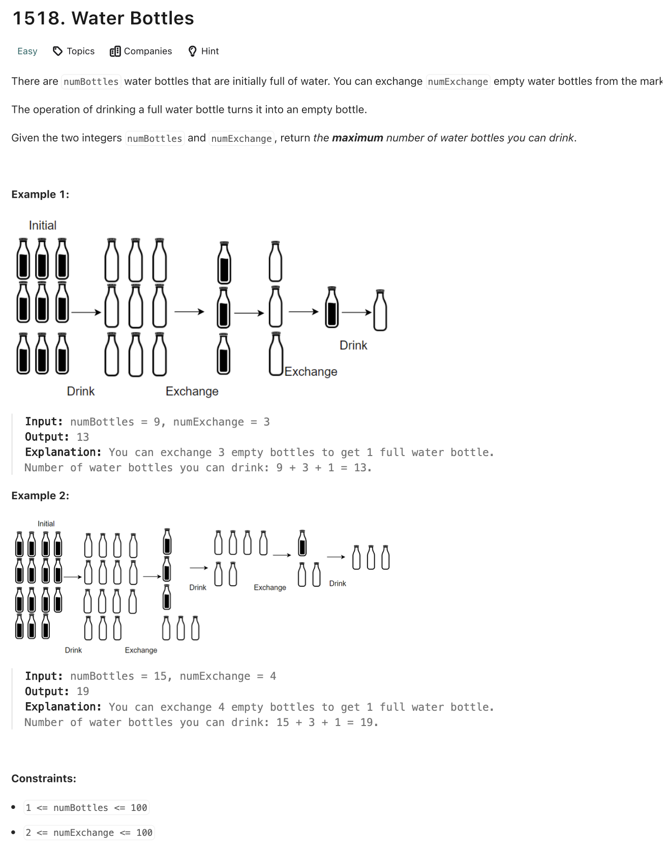 def numWaterBottles(self, numBottles: int, numExchange: int) -> int: