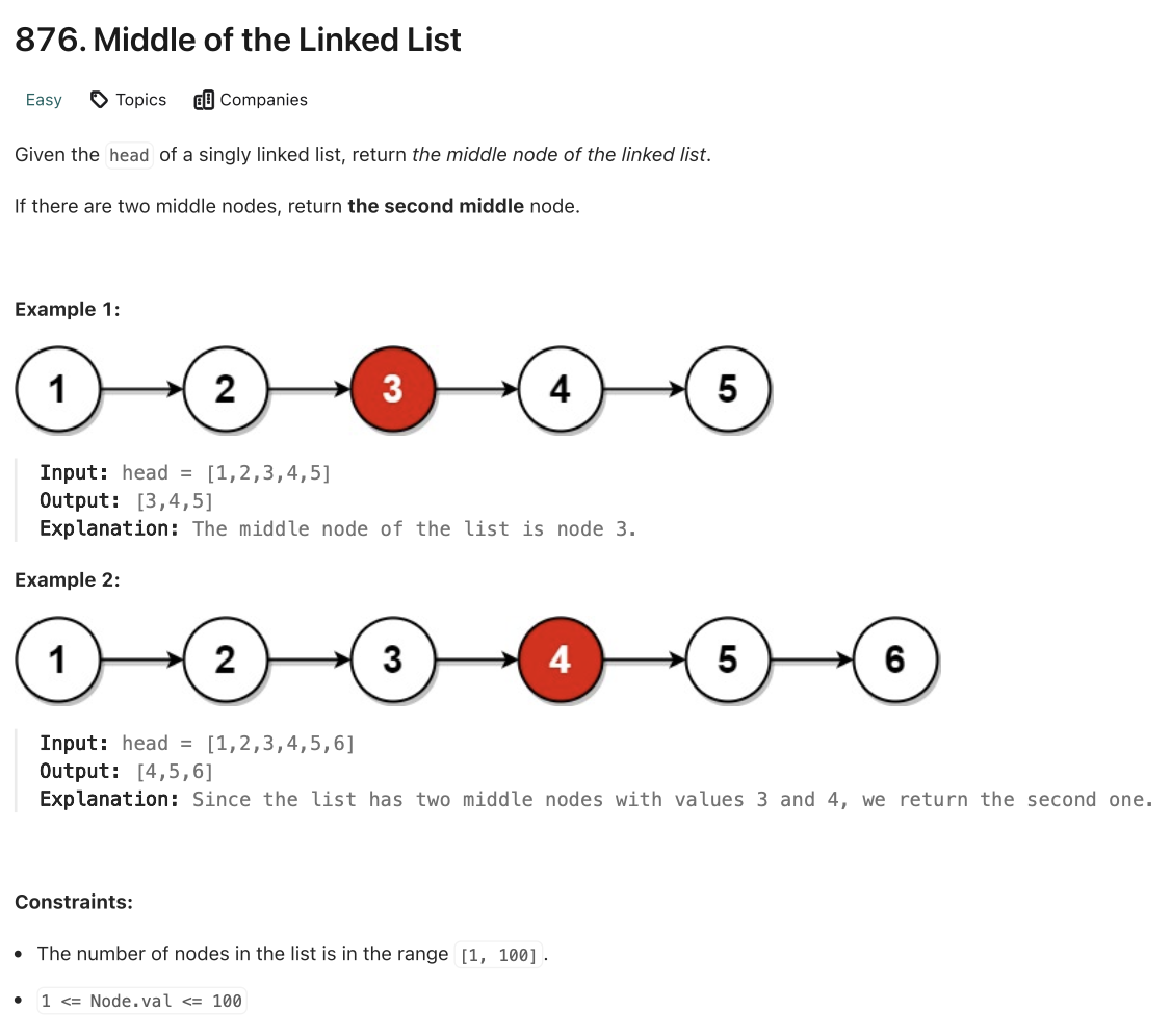 - 리스트를 두 번 순회: 첫 번째 순회로 길이를 계산, 두 번째 순회로 중간 노드 탐색.
