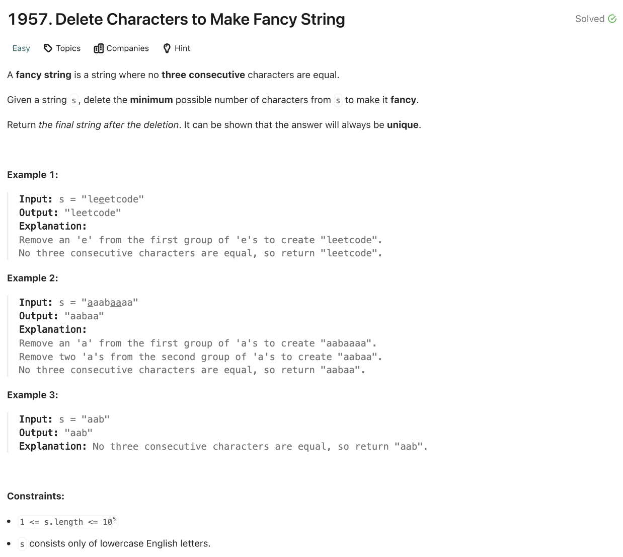📌 LeetCode [1957]: Delete Characters to Make Fancy String