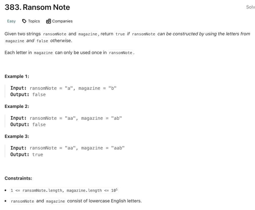 주어진 문자열 ransomNote가 문자열 magazine의 문자들만으로 구성될 수 있는지 확인하는 문제입니다.